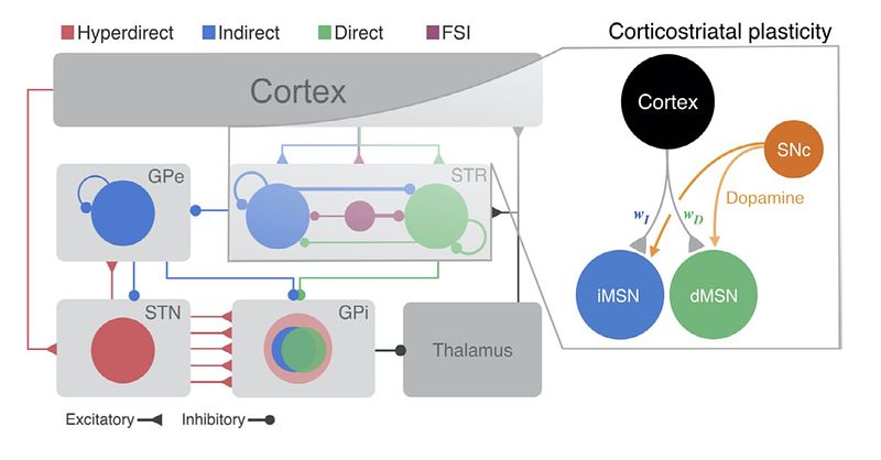 The basic cortico-basal ganglia-thalamic architecture, with dopamine-dependent corticostriatal plasticity, forms the starting point for much of our work.