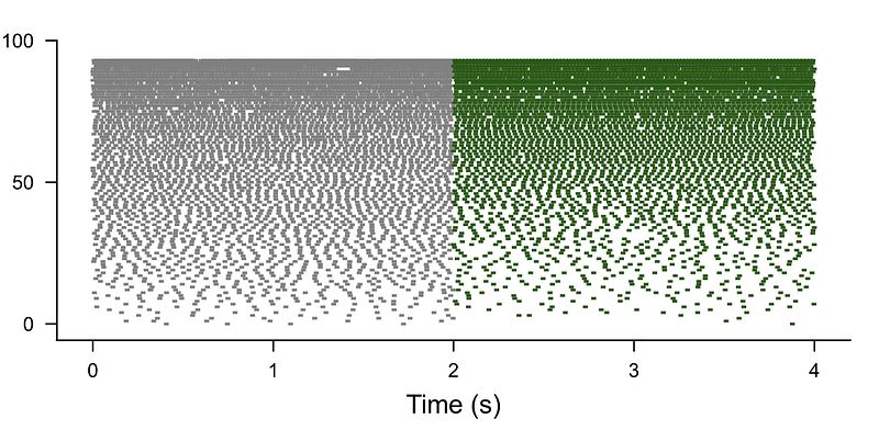 Example spike rasters of experimentally recorded (grey) and model (green) SNr neurons.